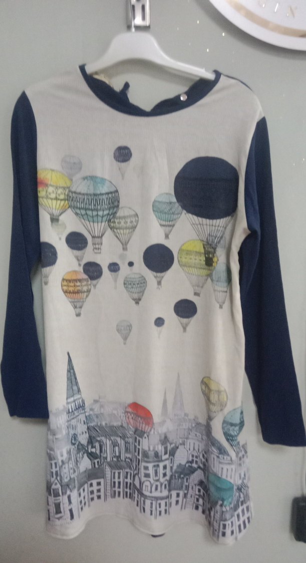 Bol kesim, uzun kollu ve yuvarlak yakalı tişört örme dokulu tekstil malzemeden yapılmıştır. Bohem tarzda, renkli sıcak hava balonları ve şehir manzarası baskısı vardır.