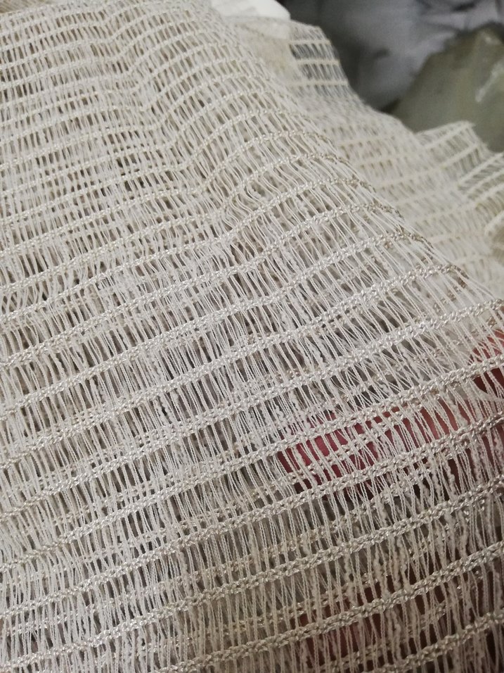Bu bohem tarzı perde, ince ve gevşek dokunmuş beyaz kumaşa sahip olup hafif gri tonlar içerir. Yumuşak ve hafif bir doku sunar.