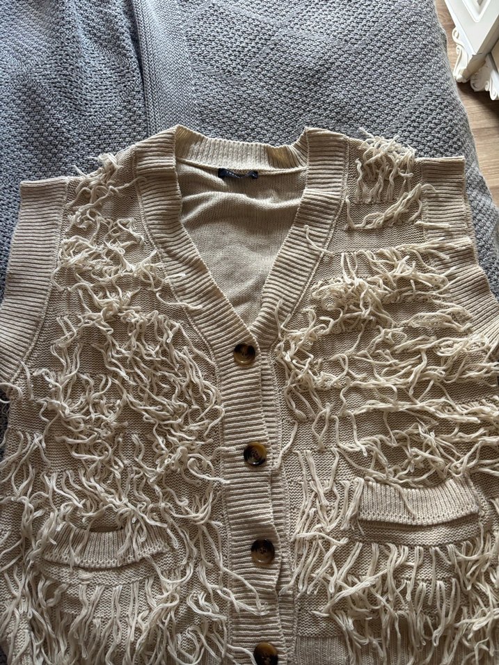 Bej renk, kolsuz, gevşek kesim ve V yaka özellikli, örgüden yapılmış bohem tarzda püsküllü hırka. Günlük kullanıma uygundur.