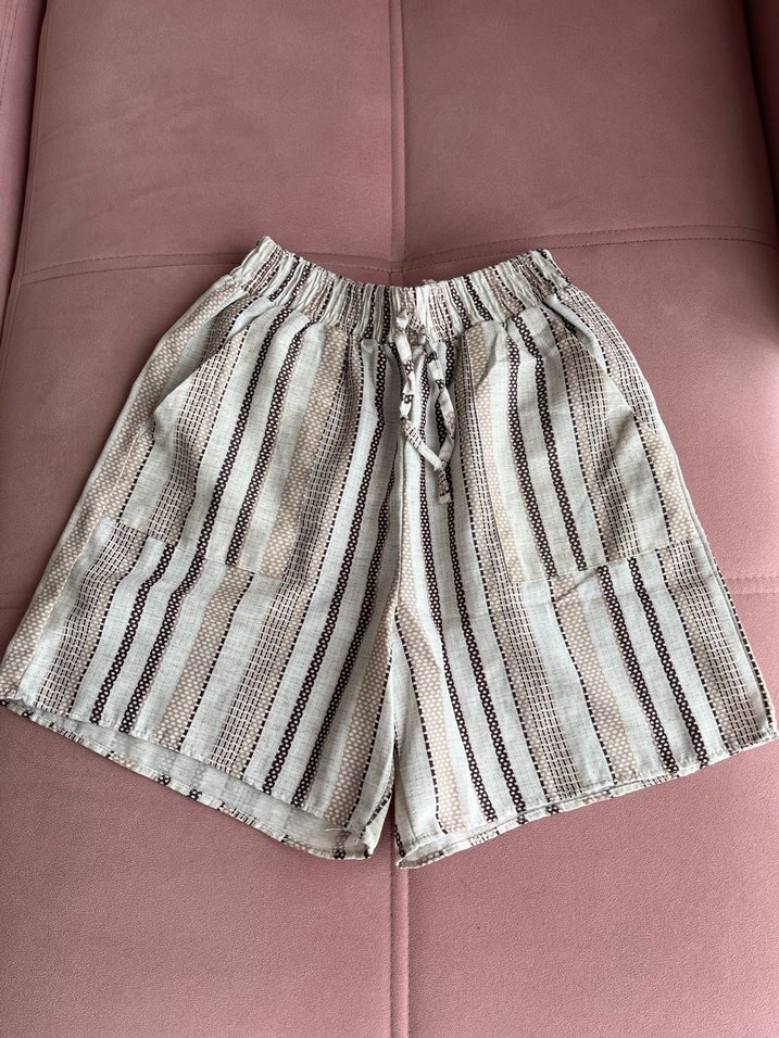 Bej renkli, pilili ve çizgili desene sahip, bol kesim kadın şort. Yumuşak pamuk kumaştan, bohem tarzı için günlük kullanıma uygun.