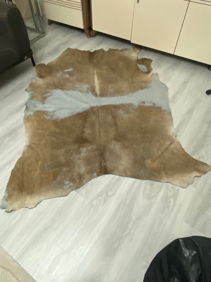 Bohem tarzda, bej ve gri tonlarında doğal deri görünümlü, desensiz ve organik şekilli halı.