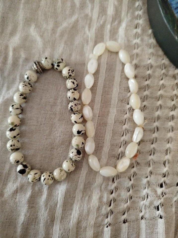 Hafif beyaz boncuklu, yılan desenli iki adet bileklik. Günlük bohem tarz için uygun, biri desenli diğeri düz boncuklu.