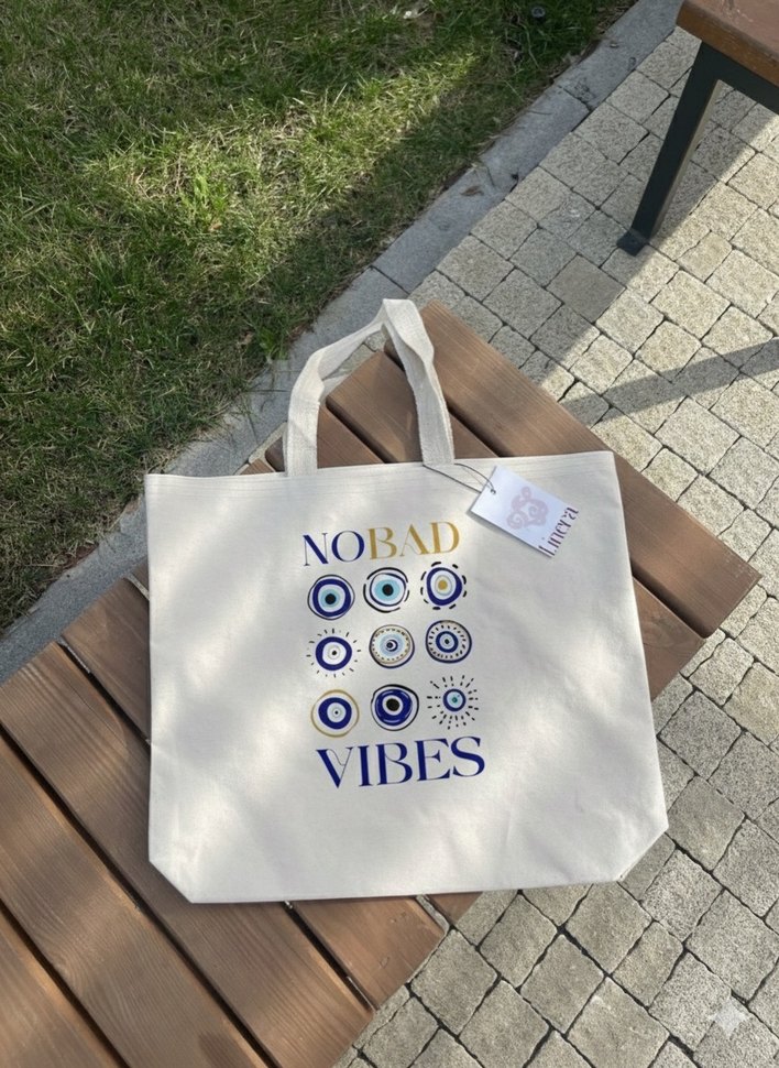 Beyaz renkli kadın çantası, 'NO BAD VIBES' yazılı ve nazar boncuğu desenli baskıya sahiptir. Kanvas kumaştan yapılmış, bohem tarzda rahat şıklık sunar.