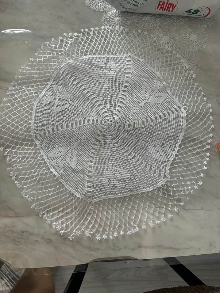 Bohem tarzı beyaz el örgüsü dantel masa örtüsü, zarif kelebek desenleri ve ince örgü kenarlarla süslenmiştir. El yapımı şıklık katar.