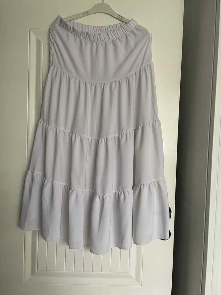 Yumuşak sentetik kumaştan, bol kesim ve fırfır detaylı beyaz uzun etek. Bohem tarzıyla dış mekan kullanımı için uygundur.