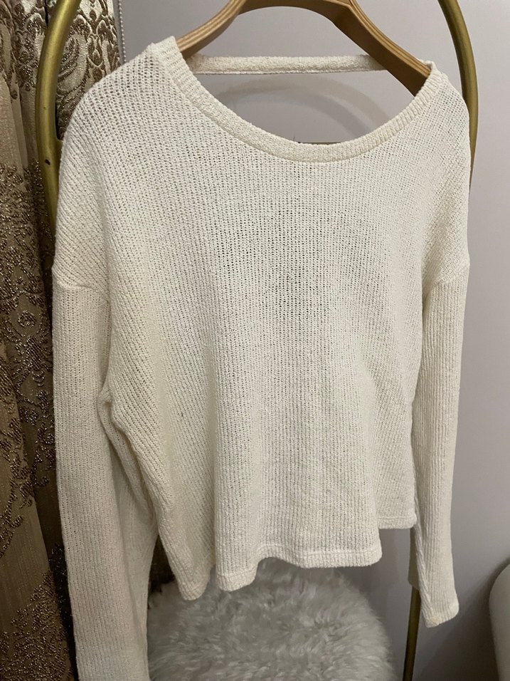 Beyaz renkli, bohem tarzda, triko örgü kazak. Yuvarlak yaka ve uzun kollu, bol kesim, normal uzunlukta, günlük rahat kullanım için uygundur.