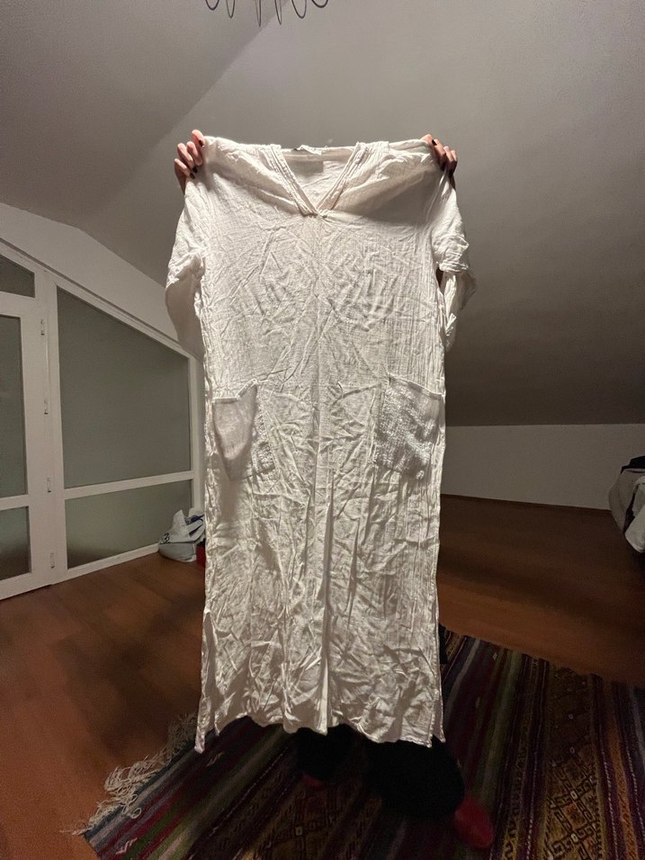 Bohem tarzı, kısa kollu, uzun beyaz robe. Rahat kesimi ve hafif yumuşak kumaşıyla dikkat çeker. ☁️