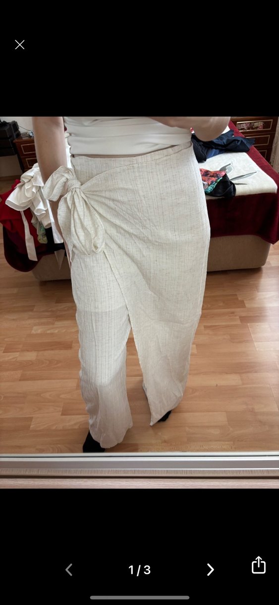 Bohem tarzı, yan bağcıklı drapeli beyaz keten midi pantolon, rahat kesim ve günlük kullanım için uygundur.
