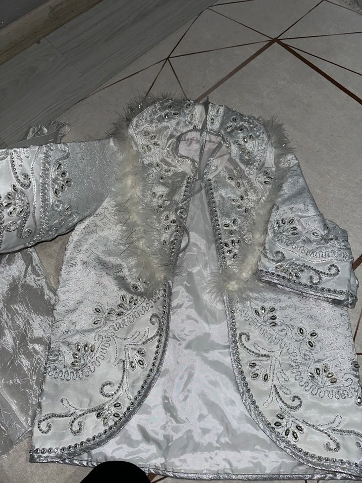 Nakışlı ve kürklü detaylara sahip, bohem tarzda beyaz, uzun kollu ve kesimli çocuk takımı.