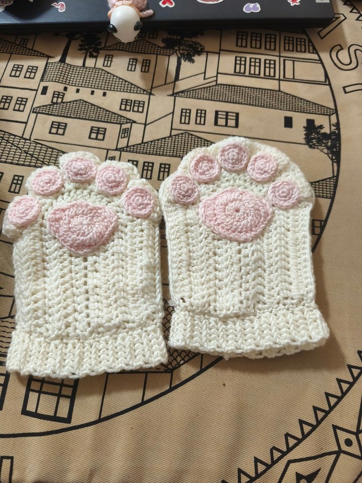 Beyaz örgü kadın eldivenler, pastel pembe pati desenleriyle bohem tarzda, rahat ve retro hippie görünüm için uygundur.