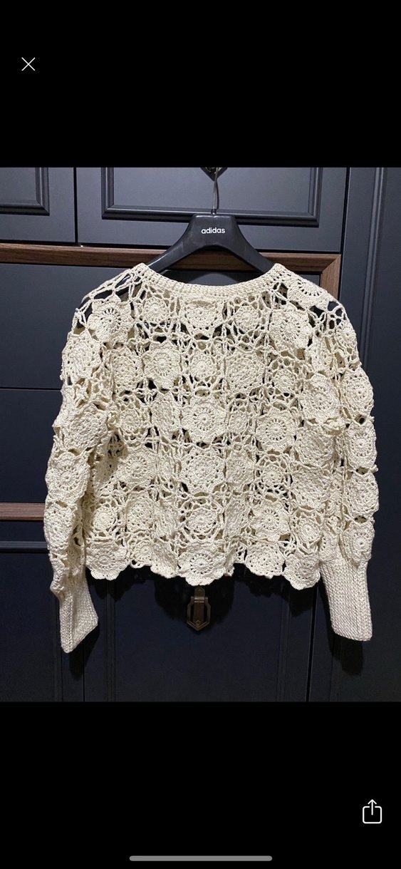 Uzun kollu, yuvarlak yakalı beyaz örgü kazak. Kısa boyu ve nakışlı deseniyle bohem tarzına uygun, rahat ve şık.