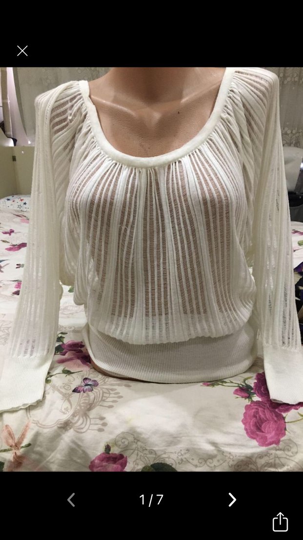 Uzun kollu, kayık yaka, bol kesim beyaz örgü kazak. Kısa ve rahat yapısıyla bohem tarzını yansıtır.