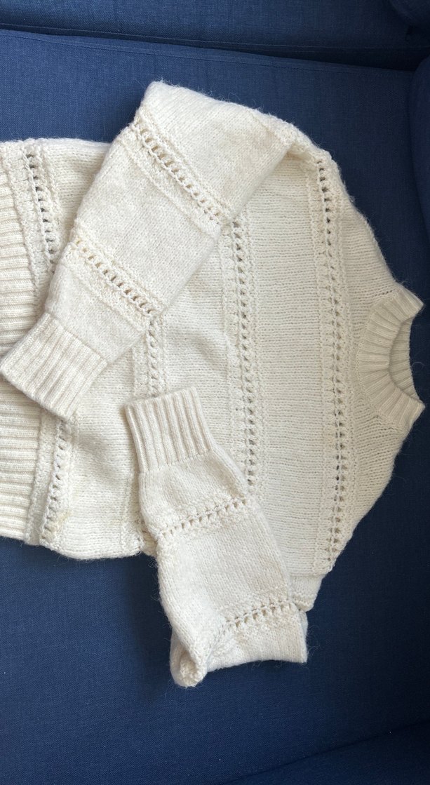 Bohem tarzı, beyaz renkli, örgü dokulu, yuvarlak yaka ve uzun kollu rahat kesim kadın kazağı. S beden ancak kalıbı bol M ve L beden olanlar da alabilir