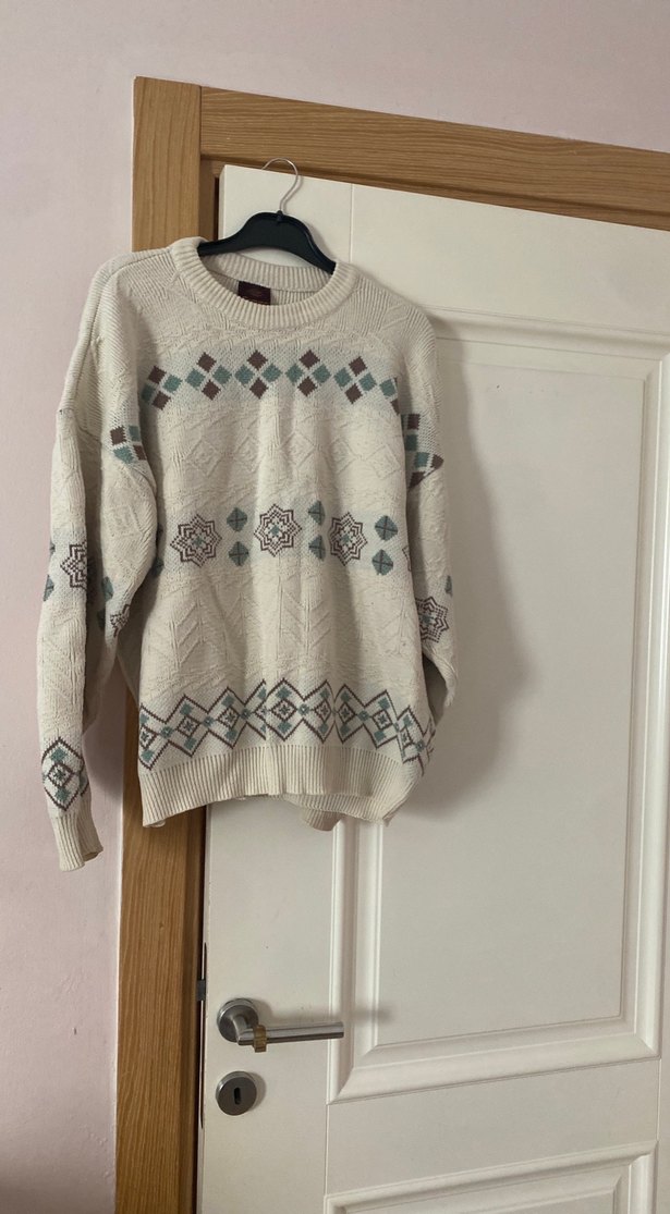 Beyaz renkli, uzun kollu, bol kesim örgü kazak. Bohem tarzı pastel geometrik desenlerle günlük kullanıma uygun.