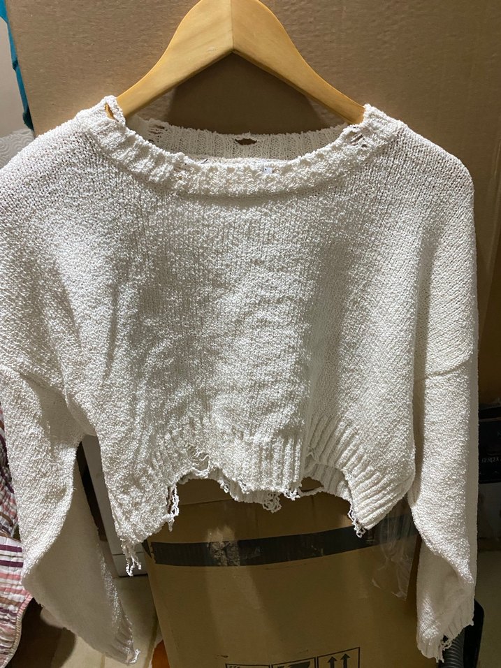 Beyaz örgü kazak, uzun kollu, yuvarlak yakalı ve bol kesimdir. Günlük kullanım için rahat ve bohem bir tarza sahiptir.