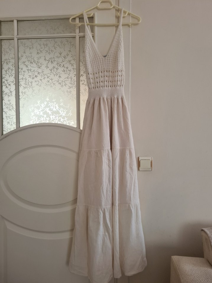 Bu beyaz triko elbise, askılı ve straplez yaka tasarımıyla bol kesimdir. Dantel detayları bohem ve retro tarzını yansıtır.