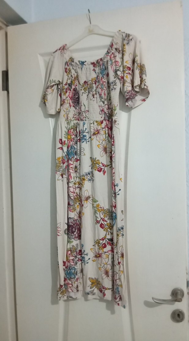 Bu bohem tarzı uzun elbise, askısız yaka, kısa kollu ve bol kesimlidir. Sentetik kumaştan yapılmış, drapeli ve beyaz zemin üzerinde renkli tie-dye çiçek desenlerine sahiptir. Günlük kullanım için uygundur.