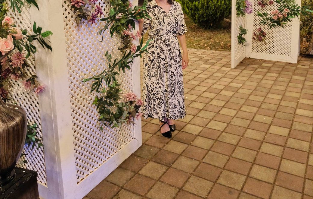 Bu beyaz uzun elbise, bol kesim, v-yaka ve desenlidir. Yumuşak sentetik kumaştan yapılmış, günlük kullanım için uygun drapeli tasarıma sahiptir.