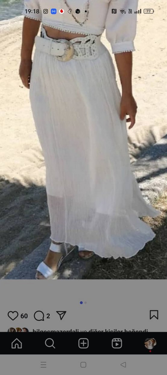 Beyaz uzun keten elbise, salaş kesim ve drapeli detaylara sahiptir. İnce askılı, kayık yaka ve hafif dokusuyla bohem ve retro tarzlara uygundur.