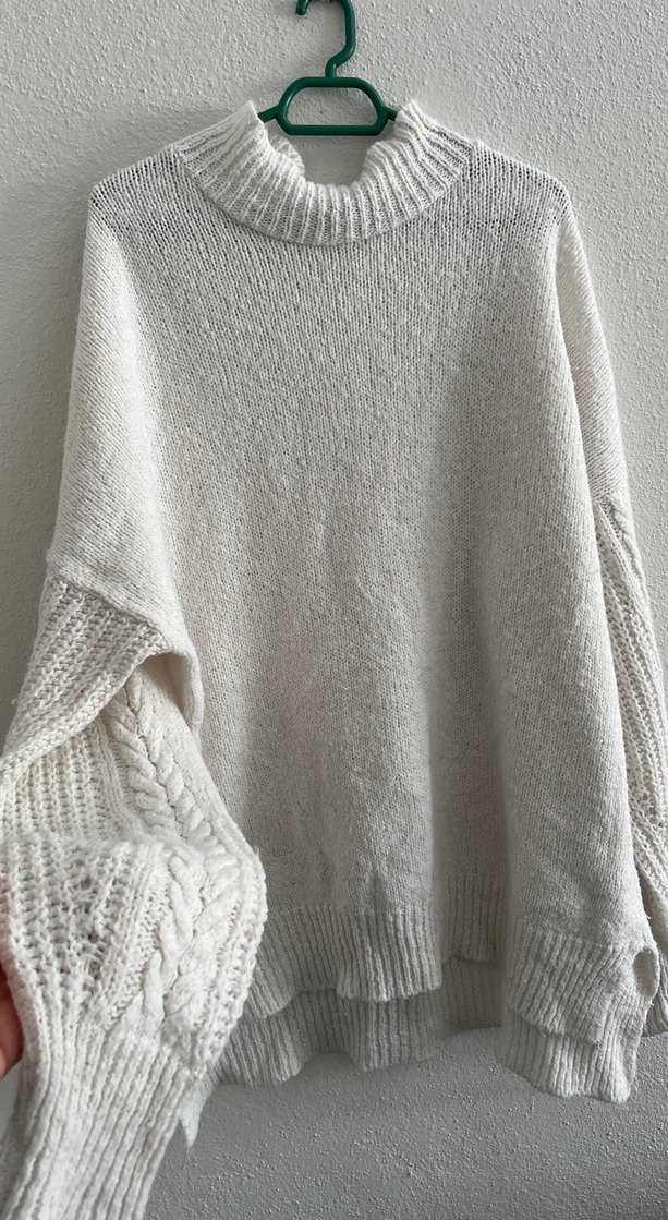 Bohem tarzı beyaz örgü kazak, yüksek yakalı ve uzun kolludur. Rahat ve bol kesimiyle günlük kullanıma uygundur.