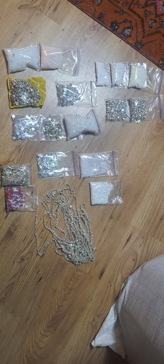 Bohem tarzı el işleri için çeşitli şekil ve renklerde parlak boncuk ve pullar içeren set. Küçük poşetlerde boncuklar ve zincirler bulunur.