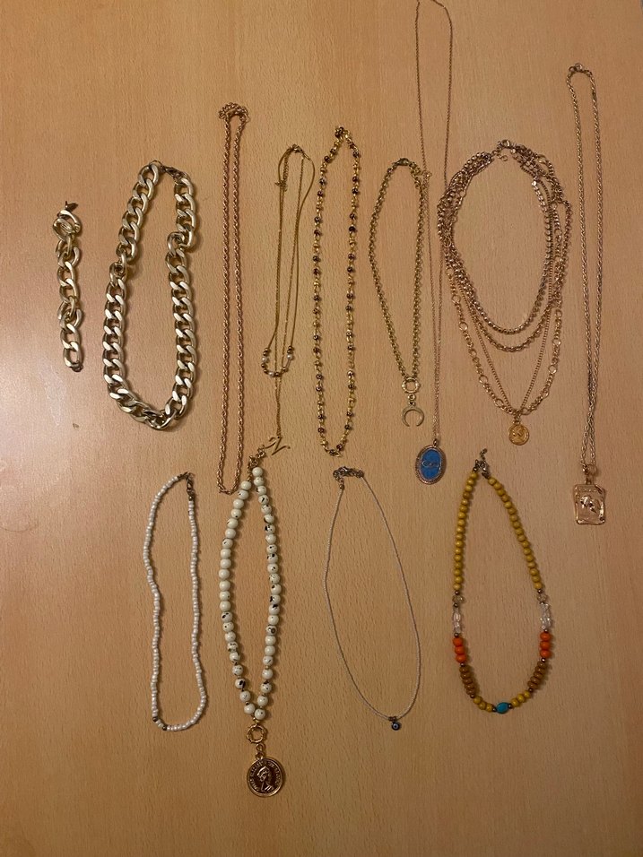 Bohem tarzı, boncuklu ve altın renkli kolyeler. Midi uzunlukta, gündelik kullanıma uygun sade tasarımlar.