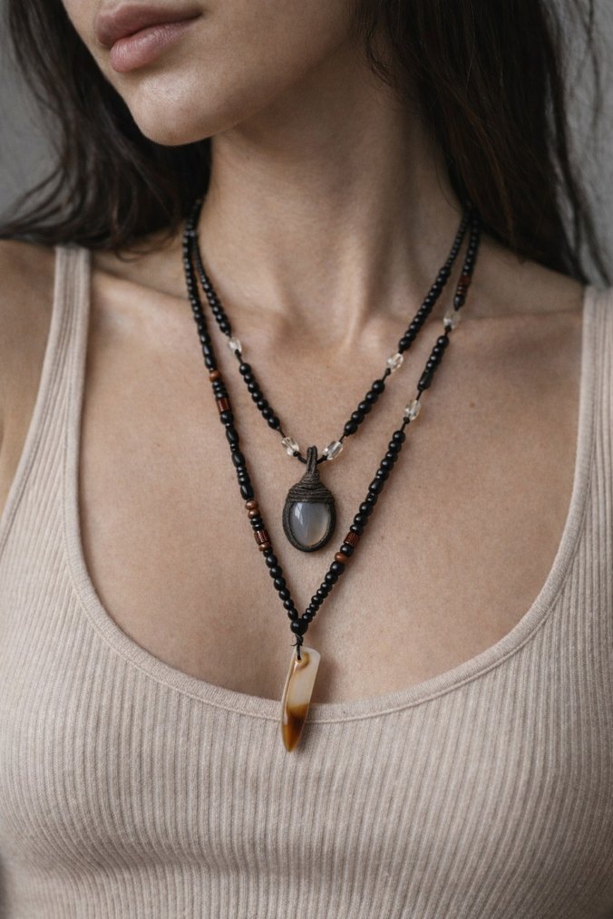 Bohem tarzı, siyah ve bej boncuklarla süslenmiş, gri ve bej tonlarında iki kolye ucu bulunan, orta uzunlukta günlük kullanıma uygun kolyeler