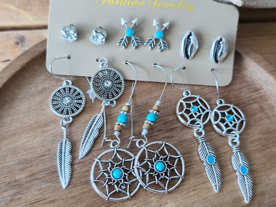 6 çift .Kısa uzunlukta, turkuaz boncuklar ve etnik desenler içeren bohem tarzı küpe seti. Günlük kullanım için uygundur, rüya kapanı ve tüy desenleri bulunur.
