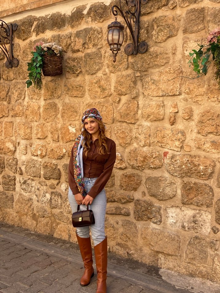 Kadınlar için kemerli, bol kesim, uzun kollu, yüksek yakalı camel renkli etnik desenli deri ceket. Günlük rahat kullanıma uygun.