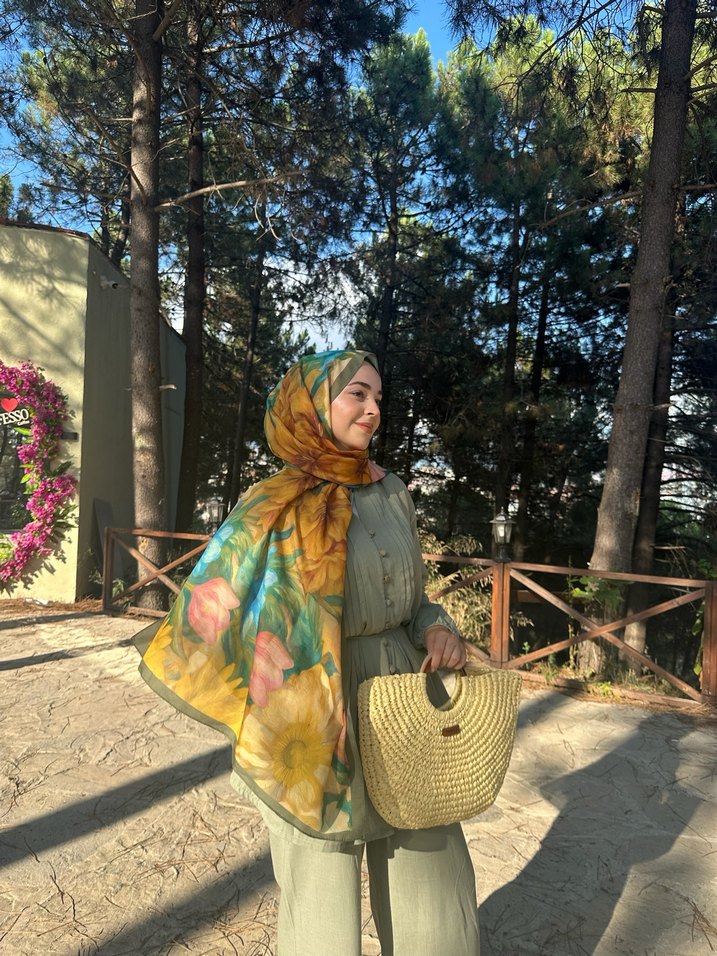 Kadın şal, hafif camel renk ve çiçek desenleriyle drapeli tasarıma sahip, yumuşak sentetik kumaştan üretilmiştir. Bohem tarz için uygundur. SEYYAR KUŞAKLI İKİLİ TAKIM BEDENLERİ MEVCUTTUR