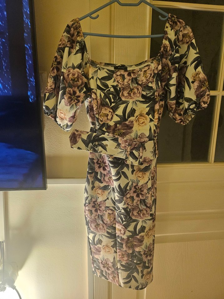 Likralı, diz üstü , balon kollu, Kemerli, drapeli tasarıma sahip kadın elbisesi. Sentetik kumaştan, koyu bej tonlarında vintage çiçek desenli, romantik akşamlar için ideal.