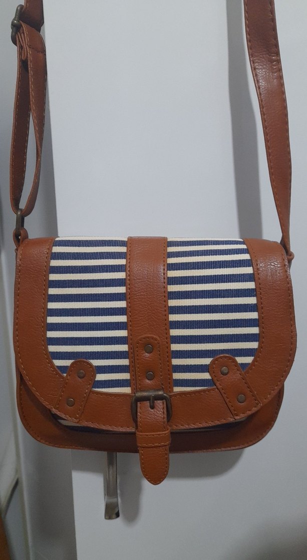Kahverengi deri, tokalı ve açık renk çizgili desenli bohem tarzı günlük kullanıma uygun çanta.