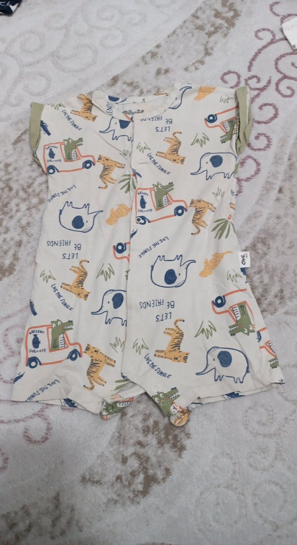 Hafif, yumuşak kumaşlı, hayvan ve araç baskılı bebek tulumu. Kısa kollu, askısız yakalı, örme ve bohem tarzda tasarlanmıştır.