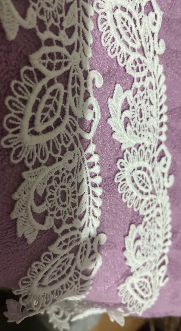 Bohem tarzı el işçiliğiyle yapılmış, çiçek desenli ince dantel şerit, yumuşak kumaş üzerine işlenmiştir.