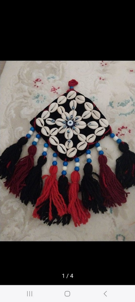 Doğal deniz kabukları ve kırmızı, siyah, mavi püsküllerle süslenmiş bohem tarzı duvar süsü. El işi boncuk detaylarıyla benzersiz bir görünüm sağlar.