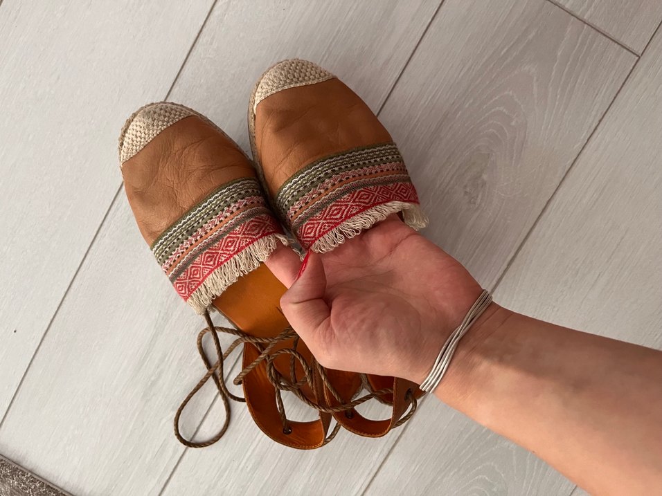 Hafif kahverengi deri dolgu topuk sandaletler, nakış desenleri ve püskül detayları ile günlük kullanıma uygun. Bohem tarzı ve rahat topuk yapısına sahip.