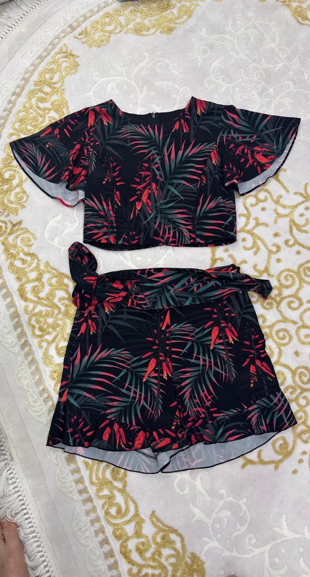 Kadınlar için bol kesim, kısa kollu, pileli tasarımlı, koyu renkli çok renkli bohem desenli şort tulum. Sentetik kumaştan, açık hava için uygun. Üst 38 alt 36
