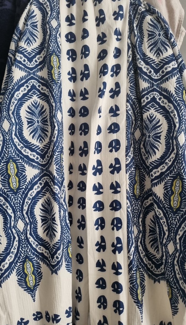 Bohem tarzı koyu mavi desenlere sahip, yumuşak kumaştan yapılmış kimona,.
