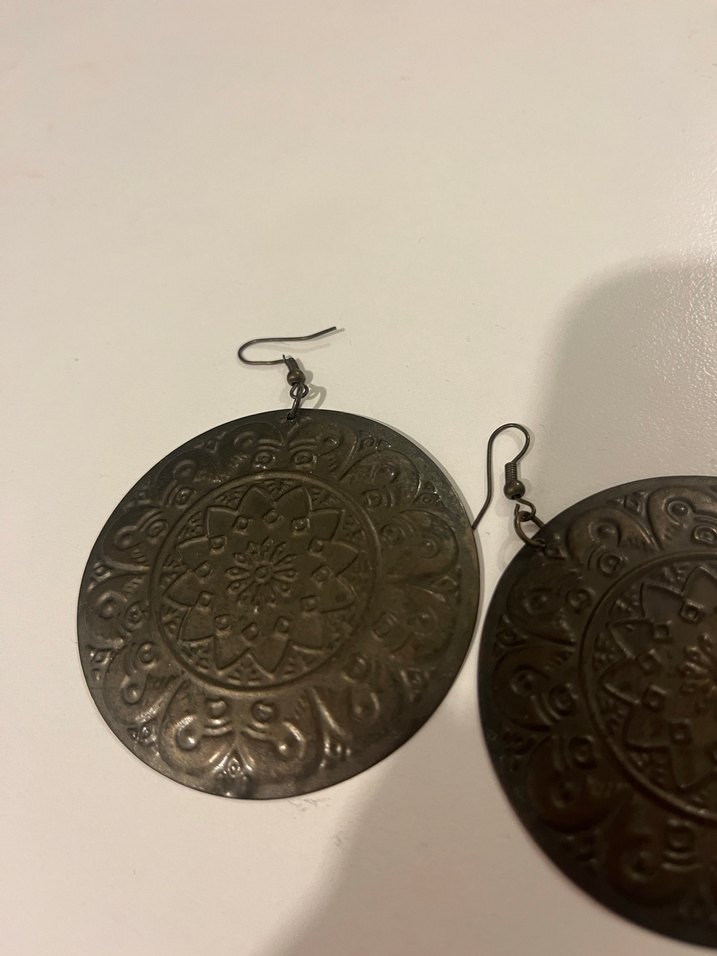 Bohem tarzı, desenli ve metalik kahverengi renkte midi uzunlukta, günlük kullanım için uygun küpeler.