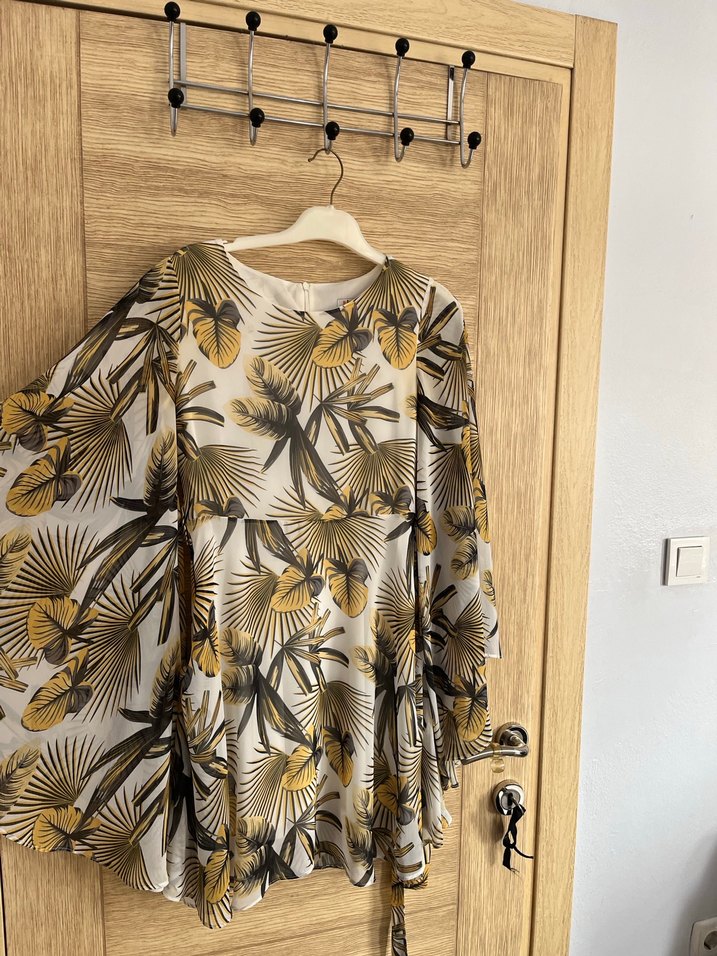 Hafif bej renkli tropikal desenli, uzun kollu, bol kesim bohem tunik. Yumuşak sentetik kumaştan, rahat günlük kullanım için uygun.