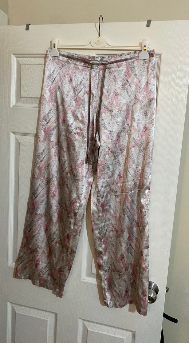 Uzun, satenimsi kumaştan yapılmış, bohem tarzı desenli pastel bej renkli, rahat kesim ve drapeli kadın pijama boyu 1 metre