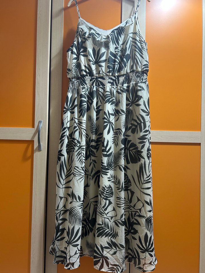 Kolsuz, straplez, bol kesim ve drapeli uzun elbise. Bej renkli, gri yaprak desenli sentetik kumaştan, günlük kullanıma uygun.