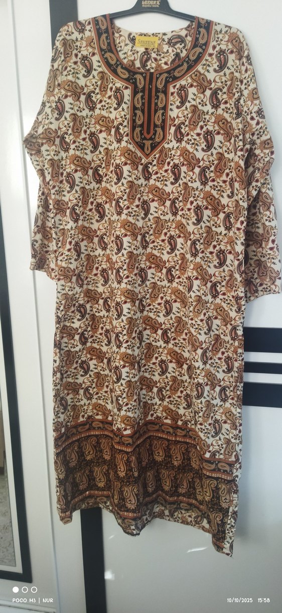 Kahverengi, desenli, yarım kollu, V yakalı, bol kesim uzun kadın elbisesi. Bohem tarzda, günlük kullanım için drapeli model. ufak kusurlari var fiyat ikisine aittir sadece elden çıksın diye satıyorum keisnlikle kullanıma engel bir durum yok iki kıyafette umreden gelen akrabam hediye getirdi .