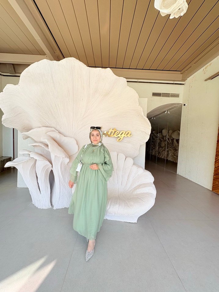 Yüksek yakalı, uzun kollu, etnik desenli, bol kesim, drapeli uzun kadın elbisesi. Yumuşak sentetik kumaştan, mütevazı stil ve düğünler için uygun.