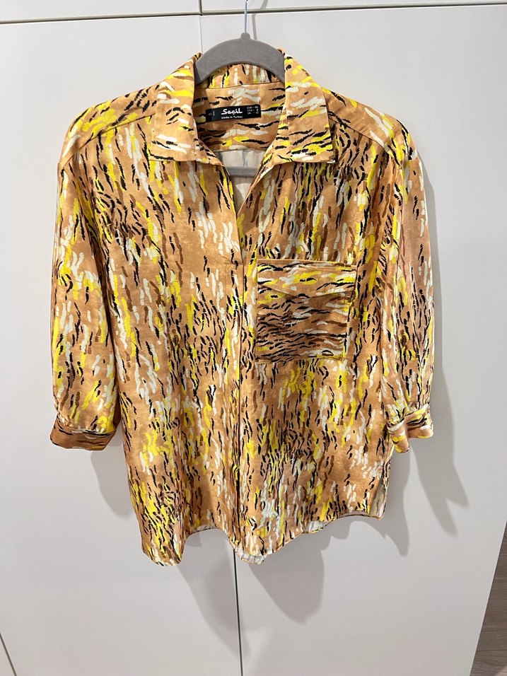 Kadın gömlek, bol kesim, kısa kollu ve yakalıdır. Açık kahverengi tie-dye desenli, düğmeli ve sentetik kumaştan, sokak tarzı için uygundur.