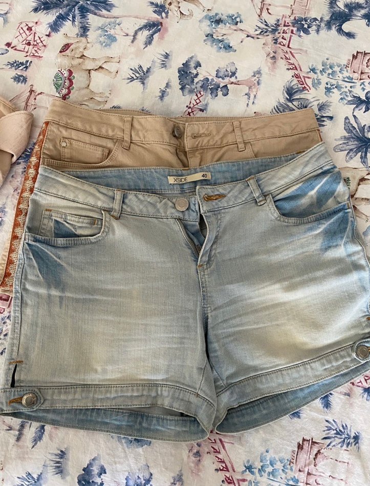 Bohem tarzı, düğmeli, bol kesim mini kot şortlar, pastel bej ve açık mavi renklerde, günlük kullanıma uygun.