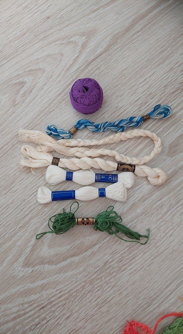 Bohem tarzı el işi için beyaz, mavi, yeşil ve mor tonlarında çeşitli nakış iplikleri ve yünler içerir.