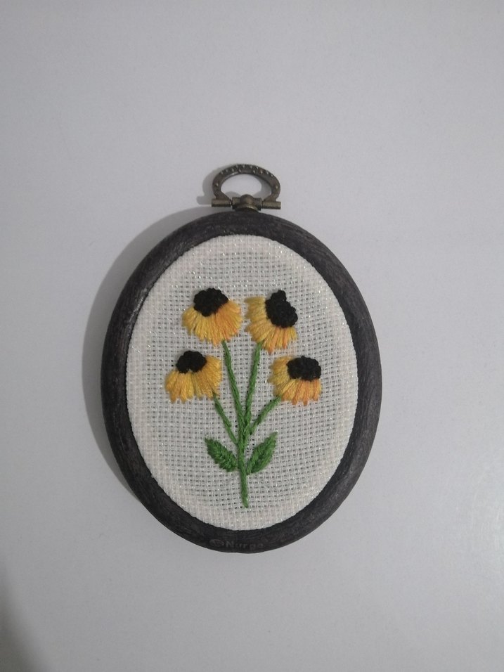 % 100 El Emeği Bohem tarzda, beyaz kumaş üzerinde siyah merkezli sarı çiçeklerin el nakışıyla işlendiği oval koyu renk dekoratif çerçeve.