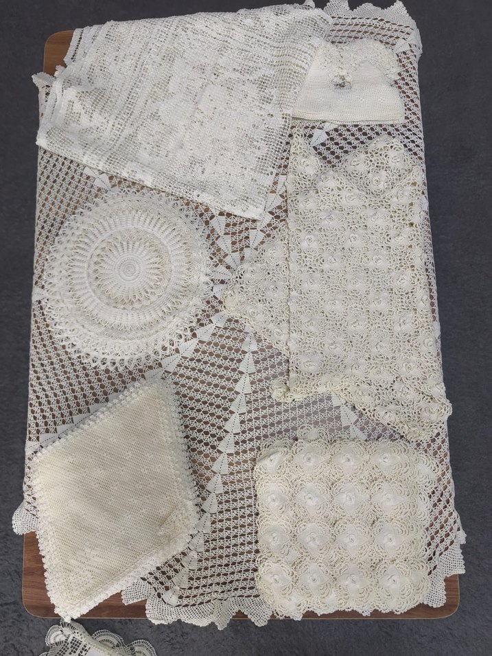 Bohem tarzda, beyaz el örgüsü dantel parçalarından oluşan, detaylı desenli ve zarif dokulu set.