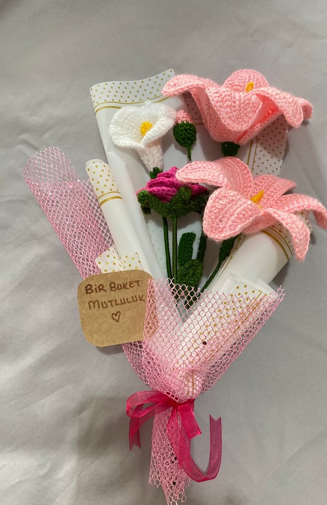 Bohem tarzı, pembe ve beyaz el örgüsü çiçeklerden oluşan buket, dekoratif tül ve kağıtla sarılmış. Üzerinde 'Mutluluk, Bir Buket' yazılı etiket bulunur. Ürün görseli bana aittir farklı renkte de yapabiliriz kutu içerisinde gönderim sağlanacaktır #örgübuket #örgüçiçek #elişiçiçek #elişibuketler